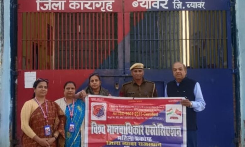 दैनिक राजस्थान समाचार बिजयनगर संवाददाता तरंनदीप सिंह विश्व मानवाधिकार एसोसिएशन जिला ब्यावर की महिला प्रकोष्ठ जिलाध्यक्ष जानवी भारवानी द्वारा बताया गया कि संस्था के राष्ट्रीय अध्यक्ष अनिल जी गौतम और उपाध्यक्ष रमेश जी शर्मा के सानिध्य में जिला टीम द्वारा सेंट्रल जेल जाकर क़ैदी भाईयों को सर्दी से बचने के लिए कंबल वितरित किये गए।