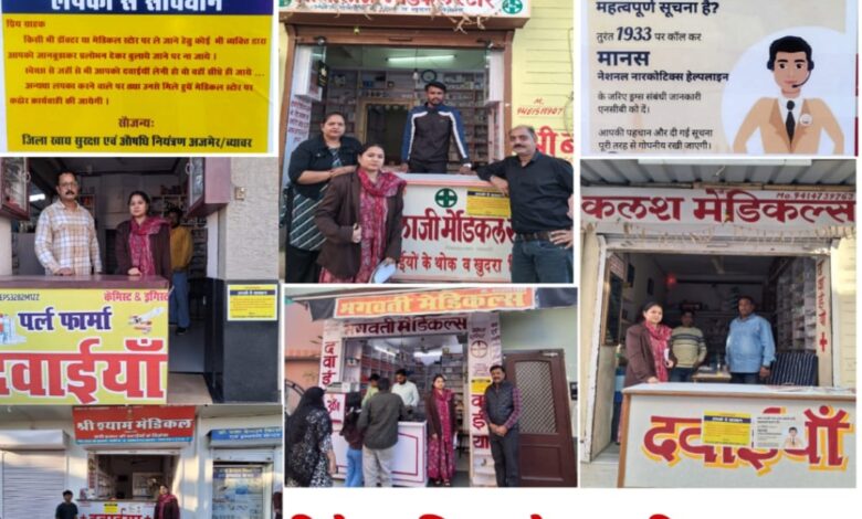 दैनिक राजस्थान समाचार बिजयनगर संवाददाता तरनदीप सिंह ब्यावर मे 15 दिसंबर 2025 सोमवार को जिला खाद्य सुरक्षा एवं औषधि नियंत्रण अजमेर/ब्यावर द्वारा लपको से सावधानी को लेकर एवं मानस नेशनल नारकोटिक्स हेल्पलाइन 1933 नंबर के जरिए ड्रग्स संबंधी जानकारी एनसीबी को देने के बारे में औषधि नियंत्रक अधिकारी मोनिका जागृत द्वारा ब्यावर शहर के मेडिकल स्टोरो पर जागरूकता अभियान चलाकर बैनर चस्पा किए