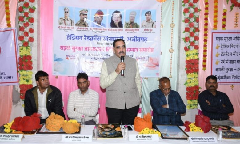 दैनिक राजस्थान समाचार न्यूज संवाददाता प्रदीप कुमार शर्मा गढटकनेत -अजीतगढ़। शनिवार 20दिसम्बर को अजीतगढ़ शहर की होटल नारायण पेलेस में इंडियन रेडक्रॉस सोसायटी के तत्वाधान में सड़क सुरक्षा जागरूकता कार्यशाला एवं स्थानांतरित व नवागंतुक अधिकारियों का सम्मान समारोह आयोजित किया गया। इंडियन रेडक्रॉस सोसायटी अजीतगढ़ के तहसील प्रभारी कपिल मीणा ने बताया कि नीमकाथाना के निवर्तमान अतिरिक्त पुलिस अधीक्षक गिरधारीलाल शर्मा, श्रीमाधोपुर के निवर्तमान तहसीलदार जगदीश प्रसाद बैरवा को स्थानांतरित होने पर भावभीनी विदाई दी गई तथा नवागंतुक नीमकाथाना अतिरिक्त पुलिस अधीक्षक लोकेश मीणा एवं अजीतगढ़ पुलिस उपाधीक्षक प्रेम बहादुर निर्भय का भव्य स्वागत -अभिनन्दन-सम्मान किया गया। समारोह के मुख्य अतिथि नीमकाथाना अतिरिक्त जिला कलेक्टर भागीरथ साख ने कहा कि कर्तव्यनिष्ठ अधिकारी जनमानस की चाहत होते हैं, सकारात्मक सोच से सबके वैध कार्य समय पर निबटाएं। निवर्तमान एएसपी गिरधारीलाल शर्मा ने कहा कि अधिकारी को जनता से हर दिन कुछ नया सीख कर अपना सर्वश्रेष्ठ देते रहना चाहिए। नीमकाथाना अतिरिक्त पुलिस अधीक्षक लोकेश मीणा ने कहा कि पूर्वोत्तर समकक्ष अधिकारियों की कार्यशैली से जनहित में कानून व्यवस्था बेहतर देना ही मेरा प्रमुख उद्देश्य रहेगा। निवर्तमान तहसीलदार जगदीश प्रसाद बैरवा ने कहा कि अधिकारी को कार्यालय एवं फील्ड में जनता को धैर्य से सुनना चाहिए और लीगल काम को समय पर करना चाहिए। सोसायटी के जिला उपाध्यक्ष राकेश कुमार लाटा ने कहा कि हम पीड़ित मानवता की सेवार्थ दृढ़ संकल्पित हैं । इंडियन रेडक्रॉस सोसायटी की अजीतगढ़ टीम बेहतरीन कार्य कर रही है। जिला सदस्य दिनेश गोविन्द शर्मा ने मंचस्थ अतिथियों एवं उपस्थित गणमान्य लोगों का आभार व्यक्त करते हुए सड़क सुरक्षा जागरूकता कार्यशाला में कहा कि बचाकर चलने के बजाय स्वयं बचकर चलना ही सबकी सुरक्षा का द्योतक है। पुलिस उपाधीक्षक अजीतगढ़ प्रेम बहादुर निर्भय ने कहा कि हमें नियमों की पालना कर दूसरों को प्रेरित करना चाहिए।इस मौके पर दुपहिया वाहन-चालकों को हेलमेट वितरित करके वाहनों पर रिफ्लेक्टर भी लगाए गए। समारोह को उपसंरक्षक सदस्य विजय यादव एवं मौहम्मद शरीफ गौरी ने भी सम्बोधित किया।इस अवसर पर अजीतगढ़ थानाधिकारी विजय सिंह, शाहपुरा आरटीओ बाबूलाल मीणा,पी के सिंह ,अनिल कुमार,देवेन्द्र परमार,राजेश शर्मा, विनोद शर्मा,महेश दीवान, रामनिवास मीणा,सीए नितिन जोशी,गोपाल मीणा, रामजीलाल, एडवोकेट शंकरलाल यादव, डॉ कमलेश कांवर, विनोद लुणाका,धर्मा सैन, सुरेन्द्र मीणा, शंकरलाल सहित अनेक गणमान्य व अधिकारी मौजूद थे।