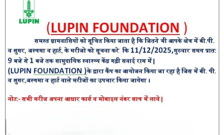 दैनिक राजस्थान समाचार को कैम्प की जानकारी राहुल (R.K.) बैरवा गढ़ी सवाईराम द्वारा दी गई है, राहुल ने बताया कि दिनांक 11/12/2025 गुरुवार को गांव गढ़ी सवाईराम में बी.पी. व शुगर, अस्थमा व हार्ट, के मरीजो के लिए राजकीय सामुदायिक स्वास्थ्य केंद्र गढ़ी सवाई राम तहसील रेनी अलवर में (LUPIN FOUNDATION) लूपिन फाउंडेशन द्वारा कैंप का आयोजन किया जा रहा है जिसका समय प्रातः 9 बजे से 1 बजे तक रहेगा, चिकित्सा शिविर में बी. पी. व शुगर, अस्थमा व हार्ट से संबंधित मरीजों की जांच कर उपचार किया जायेगा ।