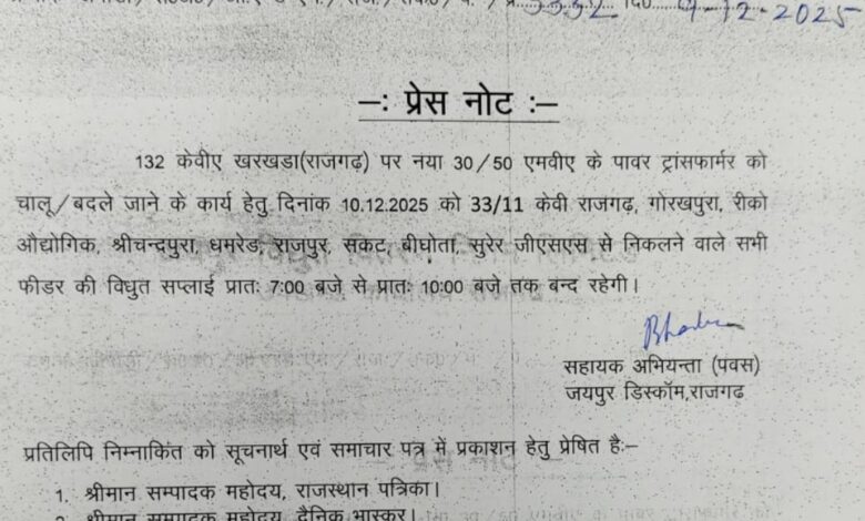 दैनिक राजस्थान समाचार नागपाल शर्मा माचाड़ी(अलवर):-राजगढ- राजगढ़ 132 केवी विद्युत सब ग्रिड़ स्टेशन खरखड़ा(राजगढ़) पर नया 30/50 एमवीए के पावर ट्रांसफार्मर को चालू/बदले जाने के कार्य हेतु दिनांक 10 दिसंबर 2025 को 33/11केवी राजगढ़,गोरखपुरा,रीको औद्योगिक क्षेत्र,श्रीचंद्पुरा, धमरेड़,राजपुर, सकट,बीघोता, सूरेर आदि फीडरो की जीएसएस (GSS) से निकलने वाले सभी फीडर की विद्युत सप्लाई प्रातः 7:00 से 10:00 बजे तक बंद रहेगी यह जानकारी जयपुर डिस्कॉम राजगढ़ के सहायक अभियंता द्वारा दी गई।