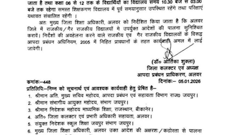 दैनिक राजस्थान समाचार नागपाल शर्मा अलवर। प्रदेश में लगातार जारी कड़ाके की ठंड और भीषण शीतलहर को देखते हुए अलवर जिला प्रशासन ने बच्चों की सुरक्षा के हित में अहम निर्णय लिया है। अभिभावकों की ओर से सोशल मीडिया एवं विभिन्न माध्यमों से की जा रही मांगों तथा मौसमी हालात को ध्यान में रखते हुए जिला कलेक्टर डॉ. आर्तिका शुक्ला ने सोमवार देर शाम स्कूलों में अवकाश एवं समय परिवर्तन को लेकर आधिकारिक आदेश जारी किए।