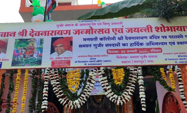 दैनिक राजस्थान समाचार राकेश तंवर बयाना | भगवती कॉलोनी स्थित श्री देवनारायण भगवान मंदिर से रविवार को श्री देवनारायण भगवान की भव्य शोभायात्रा श्रद्धा एवं उत्साह के साथ निकाली गई। शोभायात्रा का शुभारंभ मंदिर प्रांगण में विधिवत पूजा-अर्चना, हवन एवं कलश यात्रा के साथ किया गया। इस अवसर पर सारथी की अंतिम बोली शेरसिंह गुठाकर द्वारा 1 लाख 61 हजार रुपए लगाई गई।
