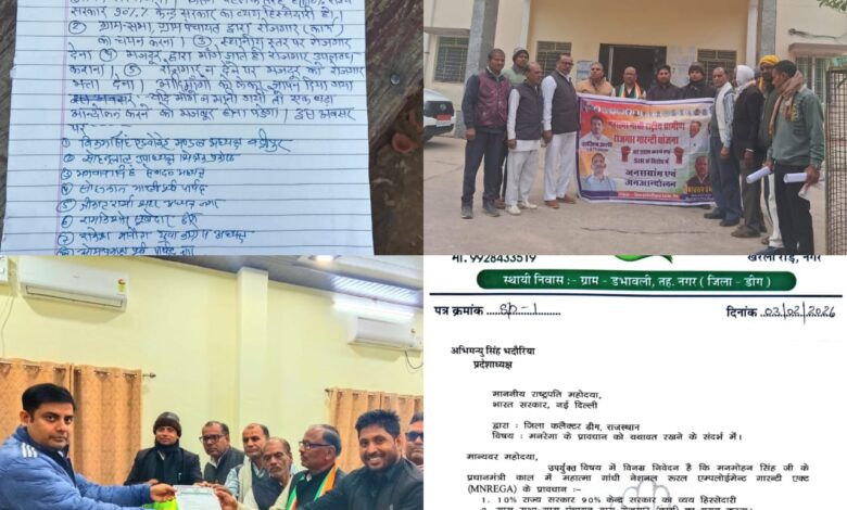 राजस्थान पब्लिक संवाद न्यूज यशपाल सोलंकी भरतपुर। दिनाँक 3 फरवरी 2026 को मनरेगा संशोधन के विरोध में कॉंग्रेस कार्यकर्ताओं ने केंद्र सरकार के खिलाफ प्रदेश अध्यक्ष शिक्षक प्रकोष्ठ अभिमन्यु सिंह भदौरिया के निर्देशन में जिलाध्यक्ष रामस्वरूप प्रभाती के नेतृत्व में कॉंग्रेस कार्यकर्ताओं ने महामहिम राष्ट्रपति के नाम जिला कलेक्टर डीग को ज्ञापन सौंपा गया। ज्ञापन में राज्य सरकार का 10% और 90 % केंद्र सरकार की हिस्सेदारी, ग्राम सभा द्वारा ही मनरेगा कार्य कर चयन, नरेगा मजदूरों की मजदूरी की राशि एवं कार्य दिवस को बढ़ाने आदि मांगों को शामिल किया गया। इस अवसर पर राकेश मानौता युवा कॉंग्रेस अध्यक्ष, विक्रम सिंह एडवोकेट मंडल अध्यक्ष, सोहनलाल उपाध्यक्ष शिक्षक प्रकोष्ठ,सोहनलाल भारती पूर्व पार्षद, श्रीकांत शर्मा शहर अध्यक्ष नगर, ओमप्रकाश पूर्व पार्षद, परमानंद, भगवान सिंह सेवादल अध्यक्ष, ठाकुर दास, कुनाल सिंह जमुना लाल, रामकिशोर सूबेदार समेत अनेकों कॉंग्रेस कार्यकर्ता उपस्थित रहे।